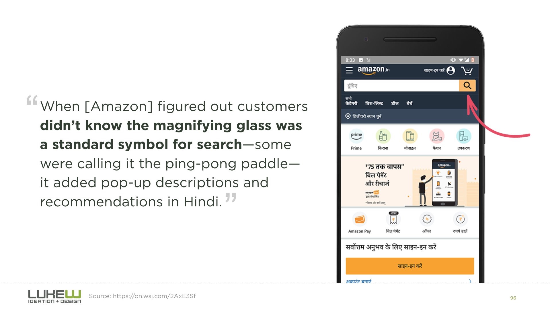 Ci potrebbero essere casi in cui l’icona della lenta di ingrandimento, anche se associata a un campo di ricerca, potrebbe essere poco chiara. Come è successo per l’app di Amazon India. Gli indiani non avevano idea che quell’icona era il simbolo della ricerca e Amazon ha dovuto aggiungere una pop-up che ne spiegasse il significato.