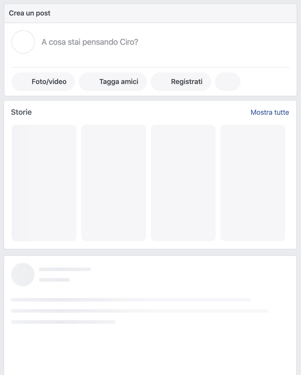 Lo stato della schermata in fase di caricamento. Alcuni servizi e prodotti digitali richiedono tempo per caricare tutte le risorse e una schermata bianca (o nera) trasmette un messaggio sbagliato, dando la sensazione che qualcosa è andato storto. La percezione del caricamento è importante. Per molto tempo i designer hanno usato barre di caricamento o spinner che danno la sensazione che il sito sia lento. Agli spinner è preferibile l’utilizzo degli “skeleton screen”, schermate che mostrano la struttura della pagina, con box grigi o colorati che mano mano di riempiono del contenuto reale, come fanno ad esempio Facebook e Pinterest.