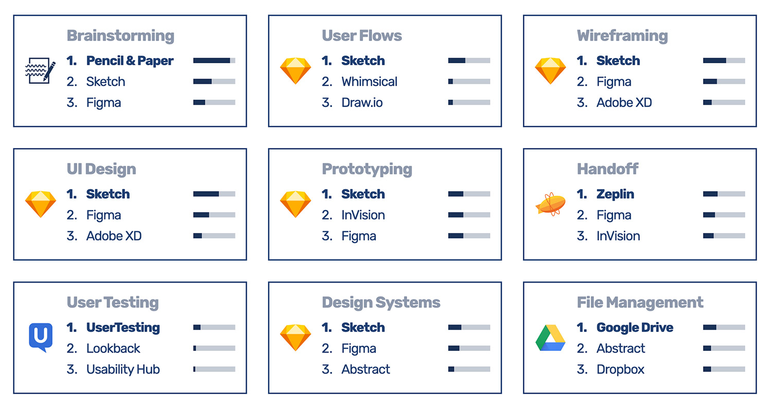 Ogni anno il sito UXTools conduce un’indagine sugli strumenti più utilizzati nella progettazione di servizi e prodotti digitali. I designer che rispondono al questionario sono perlopiù UX designer, Product designer, Web designer, UI designer. Negli anni precedenti i vincitori nelle varie categorie erano ben definiti, quest’anno le distanze si sono assottigliate.
