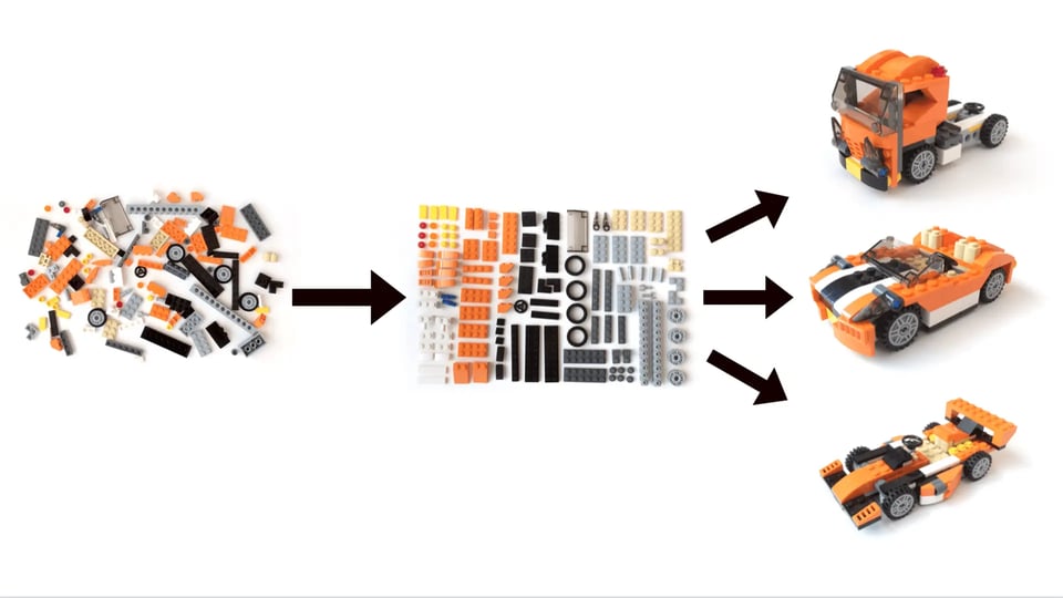 Questi pezzi – come ad esempio un menu di navigazione, una sezione, una card, una modale, un bottone – servono a costruire una pagina, una schermata. La metafora più usata per descriverli è quella dei mattoncini Lego. Come i Lego, possono essere usati per costruire cose diverse, ma ogni pezzo mantiene la sua identità e può essere riutilizzato.